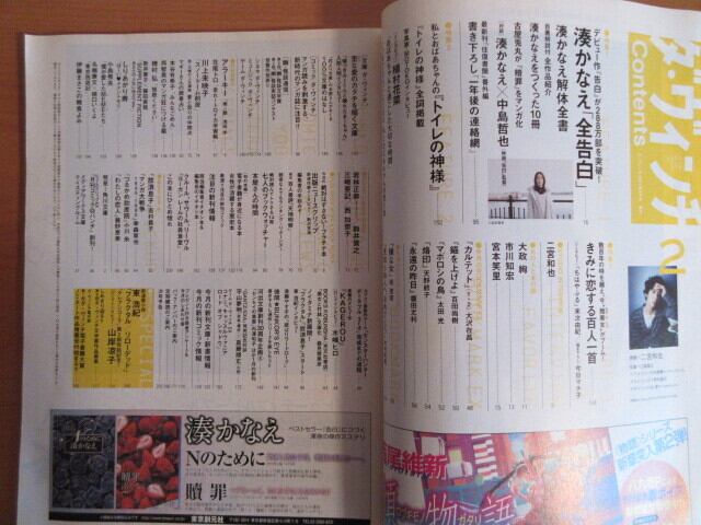 デビュー作『告白』が大きな話題となった後もコンスタントに発表し続ける作品はどれもランキング入りする売れ行き、デビュー2年半にしてベストセラー作家となった湊かなえさんの人物像に徹底取材で迫る特集や、植村花菜さんのヒット曲『トイレの神様』にちなんだ特集ほか、話題の本、新刊紹介&作家インタビュー、注目の文庫・コミックの紹介など、本に関連する情報がたくさん掲載されています。